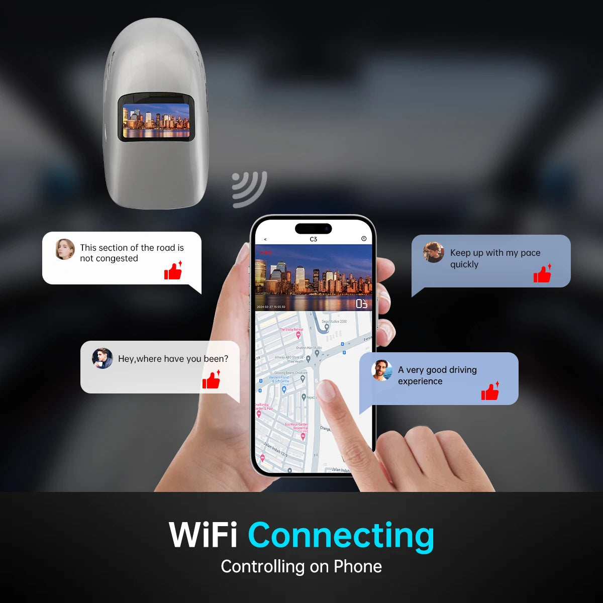 This AI Car Dashcam features a 2.5K Dual-Lens DVR, night vision, a wide-angle HD IPS screen, motion detection, a G-sensor, and app control. It supports loop recording, WDR, and ADAS, with a 2K front camera and up to 128GB (Not Included) memory card support.