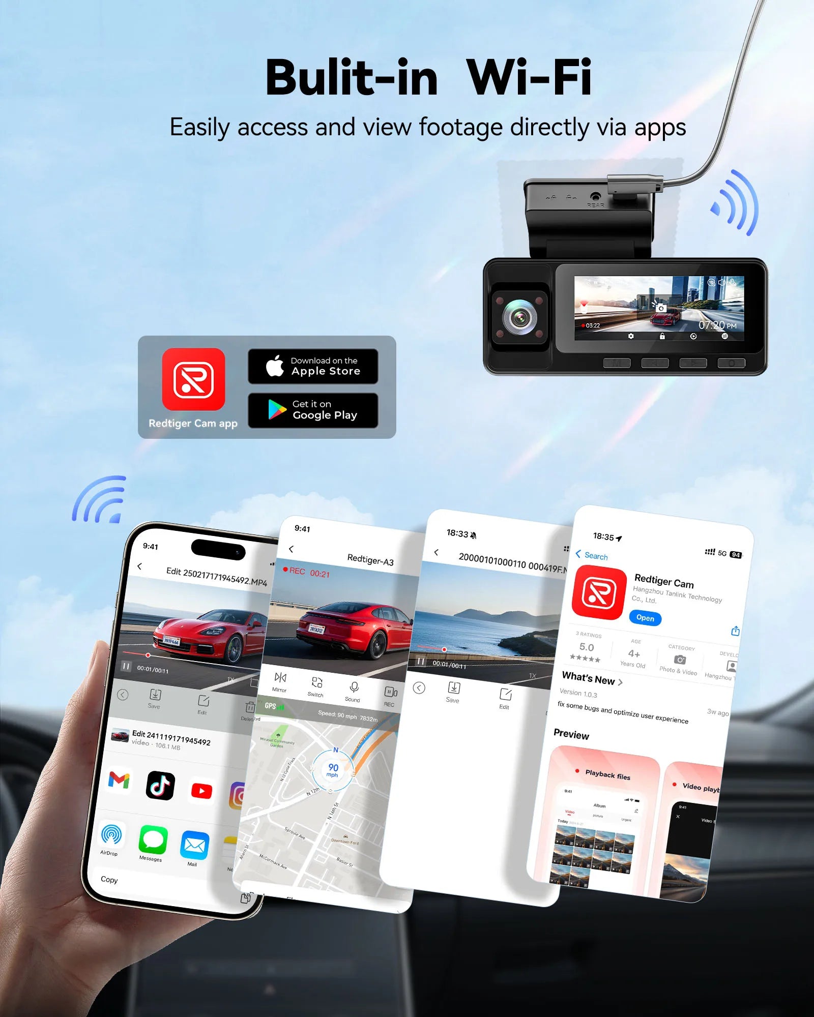 REDTIGER A3 Dash Camera, 3 Channel, 2.5K Front + 1080P Dash Cam Front and Rear and Inside