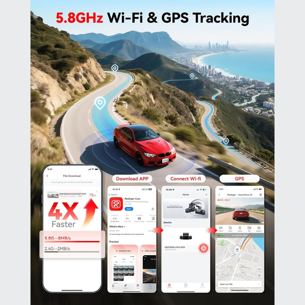 [ 4X Faster 5.8GHz WiFi & Built-in GPS ] With ultra-fast 5.8GHz WiFi, enjoy 4X faster video transfers and real-time access through the Redtiger Cam app. Easily preview, edit, and share footage from your 4-channel car camera's dash cam. Built-in GPS accurately tracks your driving speed, route, and location. All video and GPS data are seamlessly synced and traceable anytime via the app, giving you complete control wherever you are.